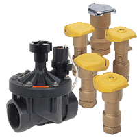 วาล์วไฟฟ้าทำหน้าที่ควบคุมการเปิด - ปิดน้ำ ในแต่ละโซนของระบบ ทำงานร่วมกับคอนโทรลเลอร์ เมื่อคอนโทรลเลอร์ส่งสัญญาณไฟฟ้า วาล์วจะเปิดให้น้ำไหลผ่านไปยังหัวสปริงเกลอร์ในโซนนั้นๆ เมื่อถึงเวลาที่กำหนด คอนโทรลเลอร์จะตัดสัญญาณไฟฟ้า วาล์วก็จะปิด วาล์วไฟฟ้ามีหลายขนาดและหลายประเภท ควรเลือกให้เหมาะสมกับปริมาณน้ำและแรงดันน้ำในระบบ