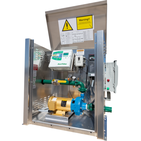 ในระบบรดน้ำที่มีขนาดใหญ่ หรือแรงดันน้ำไม่เพียงพอ อาจจำเป็นต้องใช้ปั๊มน้ำเพื่อเพิ่มแรงดัน ตู้ควบคุมมอเตอร์และปั๊มทำหน้าที่ควบคุมการทำงานของปั๊ม ให้ปั๊มทำงานเมื่อต้องการรดน้ำ และหยุดทำงานเมื่อสิ้นสุดการรดน้ำ ตู้ควบคุมนี้มักมีระบบป้องกันมอเตอร์ เช่น ระบบป้องกันกระแสไฟเกิน หรือระบบป้องกันน้ำแห้ง